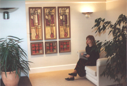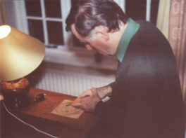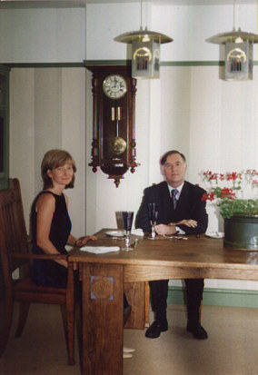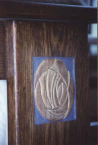 In the photo labelled “Our wall and steps” you can also see a lamp which we rescued from the Spirella Building — one of the landmarks of Letchworth which was being renovated in 1998 for £11 million. We acquired a new drive and revamped front garden — no, we didn't do the drive ourselves, though it was such hard work supervising the men and arguing with the boss that it still exhausted us. However, having seen the way the experts removed two large trees, I bought myself a chain-saw and demolished a tree which was in danger of falling over and landing on the Guide Hall just behind our back garden. The next skill I acquired was wood-carving, to add some Mackintosh roses to an oak dining table we've had made — a copy of (half of) the dining room table from his “House for an Art Lover”. I bought some tools, borrowed another book from the library, and you can see the results below. We moved large quantities of earth from a garden in Hitchin to our greatly extended plot in the front garden, and Renata was forced to visit even more garden centres to fill it with plants. We also made the picket fence at the front and on the right-hand side, and some trellis on the left-hand side.