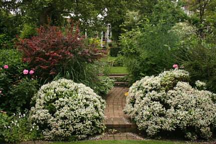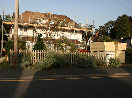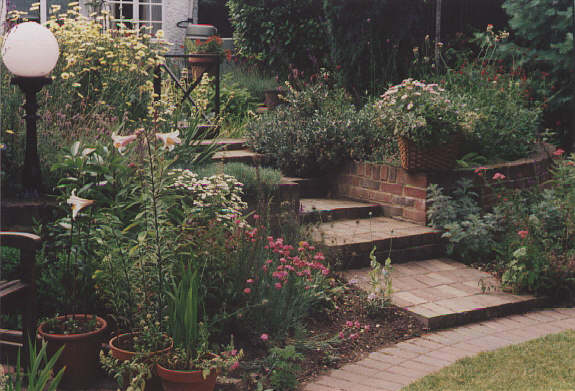 By 2004 the wall in the front garden (built with the cheapest bricks available by the people who did the drive) was deteriorating — the bricks in the top row were starting to split — so we covered the wall in pebbledash and painted it white — it looked much better (for a time). Renata was concerned to do this before the plants started growing, and she was also very worried because she'd agreed to open the garden to the public (along with a number of others in Letchworth) to raise money for charity and was concerned that everything should be perfect. I'm pleased to report that on Sunday 27th June 2004 she had 432 visitors, received many enthusiastic comments, and was totally exhausted for the next few days! The next Open Garden day was on Sunday 25th June 2006, and this time I was around to check people's tickets as they arrived (since that was the job which did not demand any knowledge of gardening). The next one was on June 29th 2008 and Renata was complaining that now she was earning a living as a gardener she didn't have time to get her own garden ready, though several people asked her how many helpers she had and were amazed to discover that on the contrary she helps other people.