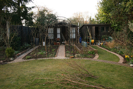 In 2012 Renata decided she needed yet more hard landscaping — the need brought on by finding a large number of unwanted paviours (concrete bricks) in one of her clients' gardens. The paths to the side and door of the summer house have been redone (the latter for the third time) and the grass path to the shed has been edged with paviours. The last thing was (I admit) my suggestion: the grass path between the second and third circles has been replaced by paviours.