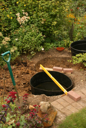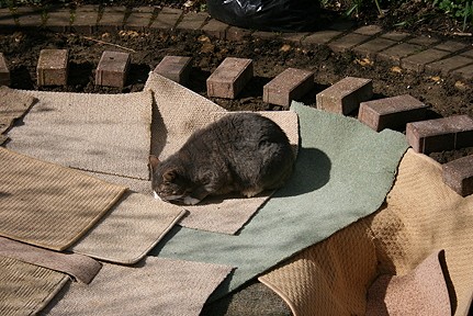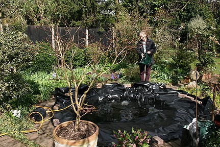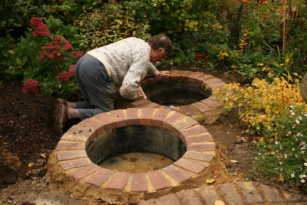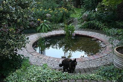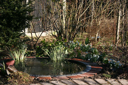 In January 2010 I demolished the two small ponds and by March the new larger one was in place — Renata has since smoothed out the earth between the edging tiles. She has decided to keep the container of the further pond in place, fill it with earth, and grow some plants which thrive in a damp environment.