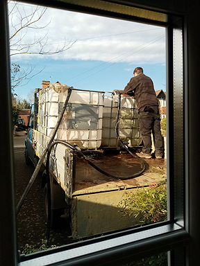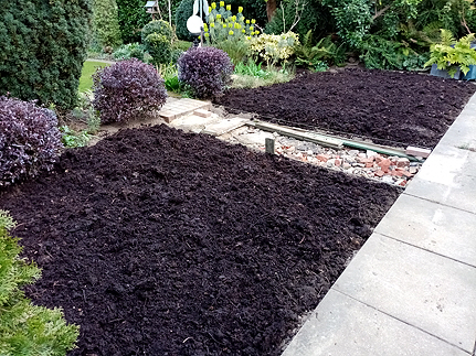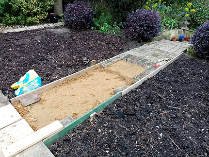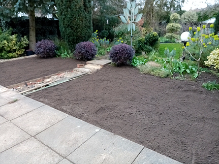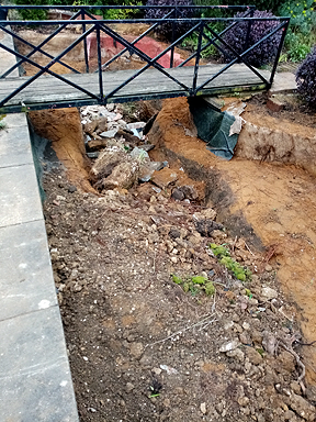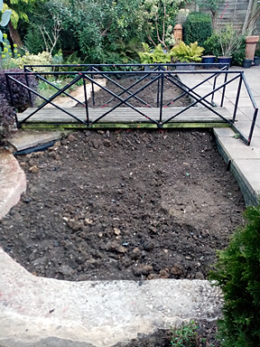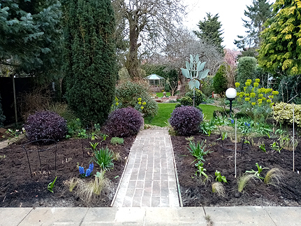 2021 — the saga still continues! Renata had never been keen on the large pond just behind the house, but it seemed an enormous job to get rid of it. After 20 years of feeding the fish, creating a new stream, buying and maintaining many pumps and filtration systems, she decided to get rid of it. On 23rd February the pond was emptied and the fish taken to somewhere in Knebworth where a new pond is being built for them. Three of our neighbours were having building work done, so I transported many barrow-loads of earth and rubble (with assistance from a few neighbours) to fill in the large hole. Renata removed some of the plastic liner — some of it will stay. All the odd-shaped paving stones round the edge have gone in, together with anything else she decided she didn't want. On 5th March, Mike Hann (who also opens for NGS and runs our local Letchworth Open Garden scheme) came to cut up the bridge and take it away — he and his wife are well organised and the whole job was done very quickly. He plans to use it to make garden sculptures. Three days late 4 tonnes of top-soil were dumped on our drive, and the wheelbarrowing started again: with some help from a neighbour we carried this to the back and into the hole. Less than two weeks start to finish, except that the soil settled and we had to add more at intervals. We needed a path where the bridge was, so on 15th March a load of aggregate, sand, cement and pavious arrived and Renata has created our final (probably) path and transformed the area into yet more garden.
