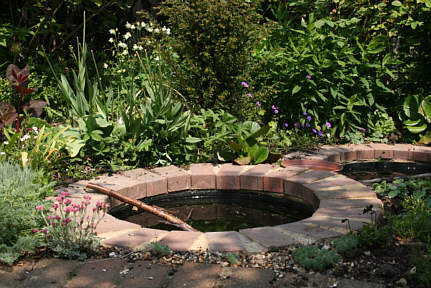 You would hardly credit it (unless you know Renata), but less than six months after we had built the new ponds she changed her mind and decided she would prefer one somewhat larger pond, using a plastic container I foolishly pointed out to her at a garden centre. We also bought a replacement stream to feed into the main pond, made of fibre glass rather than the existing chunks of concrete, and Renata redid one of the paths to be brick rather than the slabs and tiles which I rather liked. She had a bad back at the end of 2008, going on for most of 2009, so this work was on hold, but in April 2009 I hired a pneumatic drill (or “breaker”, as we say in the trade) and broke up the old concrete stream, and we installed the new one, which involves a length of guttering, a dog's anti-scratch collar and a plastic flower pot with holes in it. We struggled with the flow of water for some time, but no matter what we tried it splashed somewhere. Basically there's too much water for the stream, so eventually using a bit of lateral thinking I made a hole in the pipe near the pump, so some of the water is pulled into the pump and immediately sprayed back into the pond. This solved the problem, and it looked as if there were some strange creature sending out ripples across the pond, which all added to the excitement. I even planted a couple of trees! We needed to get things done so that the garden had time to recover before the Open Days…