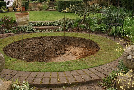 2017 — the saga continues! Renata was feeling guilty about depriving the frogs and newts of their habitat, so she was thinking of making a wildlife pond in the middle of the bottom lawn — the largest of our three circles. I didn't think this was a good idea, and I suggested replacing the middle lawn with a pond. She decided to go for this. We weren't opening the garden that year, so it was a good time for any major changes. Here you see the progress.