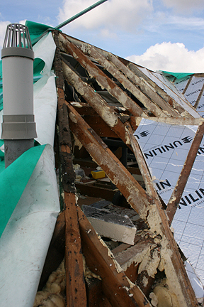 This is the entry from the original prospectus. The house was built by a firm in Hitchin, the nearest large town to Letchworth. It had two rooms downstairs (front and back, the front room the full width of the house and the back room narrower to allow for a W.C.) and three bedrooms upstairs (the front room the full width of the house and the two back rooms side-by-side). The two back bedrooms and the scullery were served by a central chimney; the living room and the main bedroom were served by a chimney on the left-hand side as you face the house. The chimneys are long gone, but the two back bedrooms still have the original fireplaces.