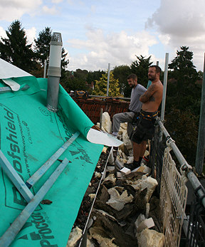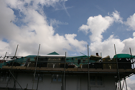 I really had thought the hard landscaping was finished, and I hadn't done anything in the garden for several years though of course Renata is always busy there. But in the Summer of 2007 she decided she didn't like the irregularly shaped small pond, which was leaking anyway, and wanted to replace it with two small circular ponds, edged with bricks to match the three lawns. We dismantled the old pond (my trusty jigsaw proving invaluable once again), Renata did the really hard work of digging the new holes, and I did the more mathematical job of laying the bricks so that the result was level, regular and circular. Renata said they looked like two vents from an underground chamber, but once she had levelled the earth and put in some plants they were fine.